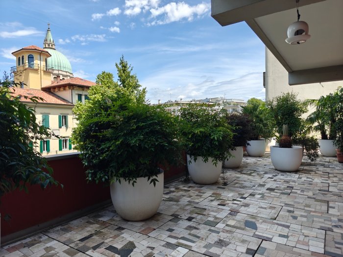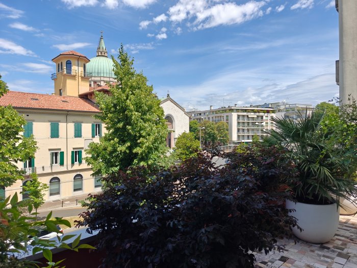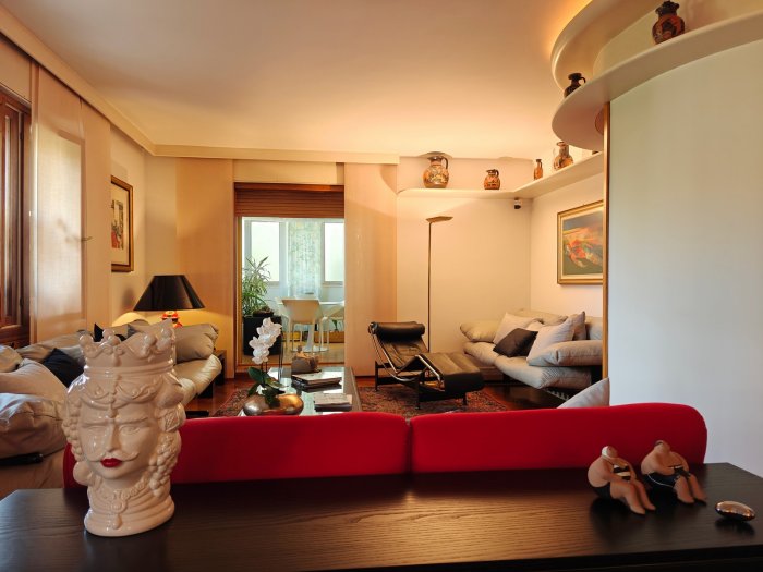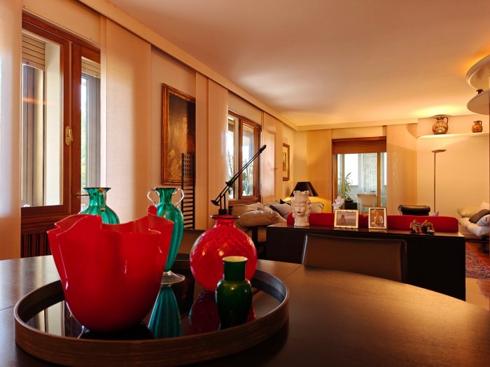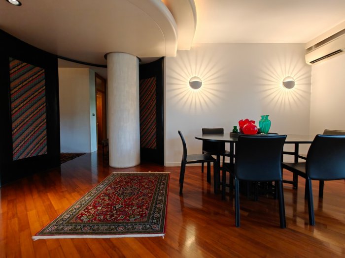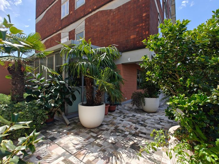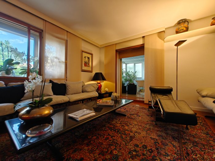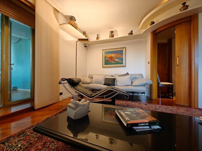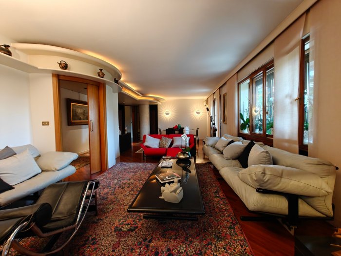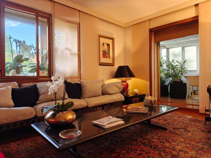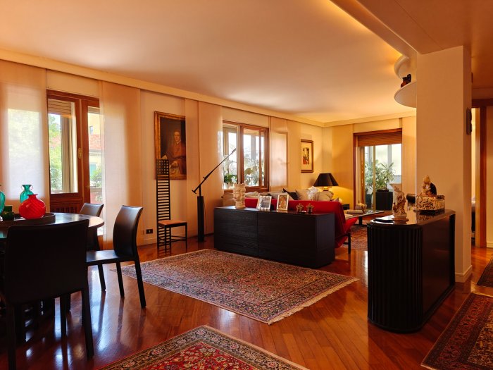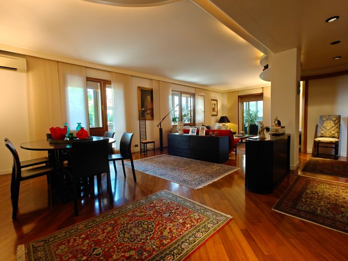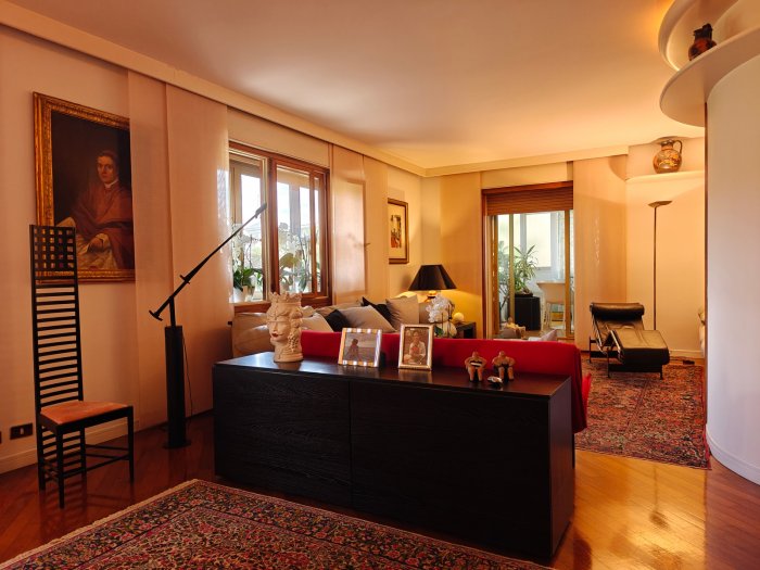 Adiacenze piazzale XXVI Luglio. A breve distanza dal centro storico, al secondo piano di signorile stabile progettato negli anni '60 da noto architetto, elegante appartamento quadricamere (250 mq) con irripetibile ampia terrazza abitabile di ca. 120 mq. L'abitazione è frutto di un'attenta e scrupolosa ristrutturazione eseguita negli anni '90, sulla base di un progetto che ha coniugato materiali di pregio, dettagli sartoriali e razionalità organizzativa. Lo spazio risulta così organizzato: ingresso con atrio di generose dimensioni e apertura dell'ascensore diretta nell'abitazione, ampio soggiorno-pranzo con accesso alla terrazza e alla veranda valorizzata come sala da pranzo aggiuntiva e giardino d'inverno, cucina abitabile con una seconda veranda adibita a locale di servizio, disimpegno notte, suite matrimoniale con bagno privato, 2 camere doppie, bagno finestrato con box doccia, ripostiglio, ulteriore veranda ad uso lavanderia-stireria, suite ospiti con camera matrimoniale bagno privato. La generosa terrazza, con l'adiacente veranda, si configura come un sorprendente giardino pensile e rappresenta una rara isola di quiete domestica, dedicata al relax e alla convivialità, "protetta" dalla rassicurante mole della cupola del vicino Tempio Ossario. Completano l'abitazione una spaziosa cantina di ca. 20 mq, sita al piano interrato e 2 comodi posti auto coperti, offerti in locazione ad un canone mensile di Euro 60,00 cadauno, siti all'interno dello stesso complesso edilizio. Riscaldamento centralizzato con valvole termostatiche e contabilizzatori di calorie. Interessante opportunità.